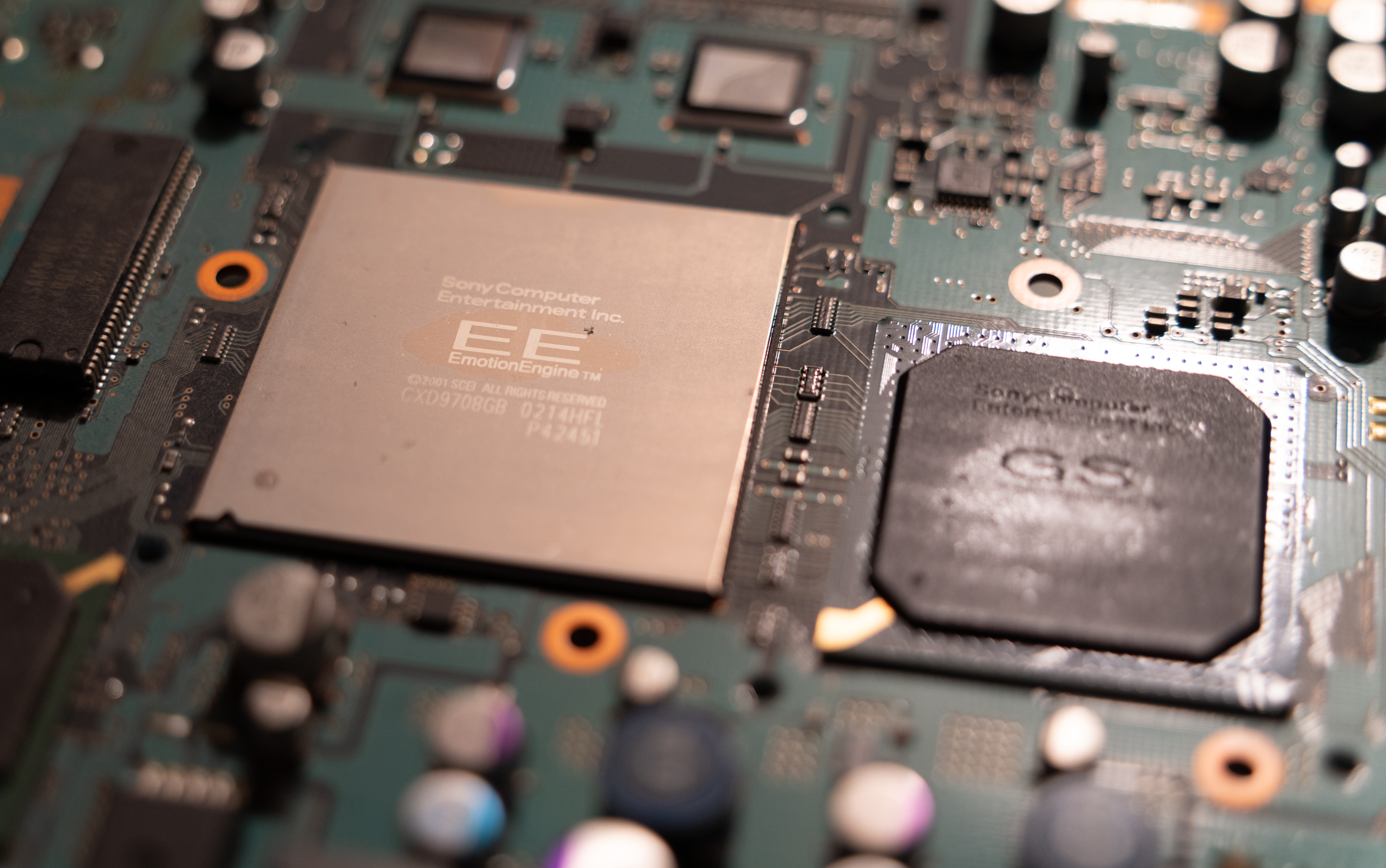 A close-up of the PS2 Emotion Engine chip A close-up of a chip that says, "Sony Computer Entertainment" A picture of the PS2 PCB, with a PlayStation-branded coin cell battery in focus.